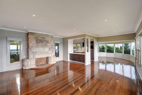 Large sandstone fireplace, which backs onto an outdoor fireplace